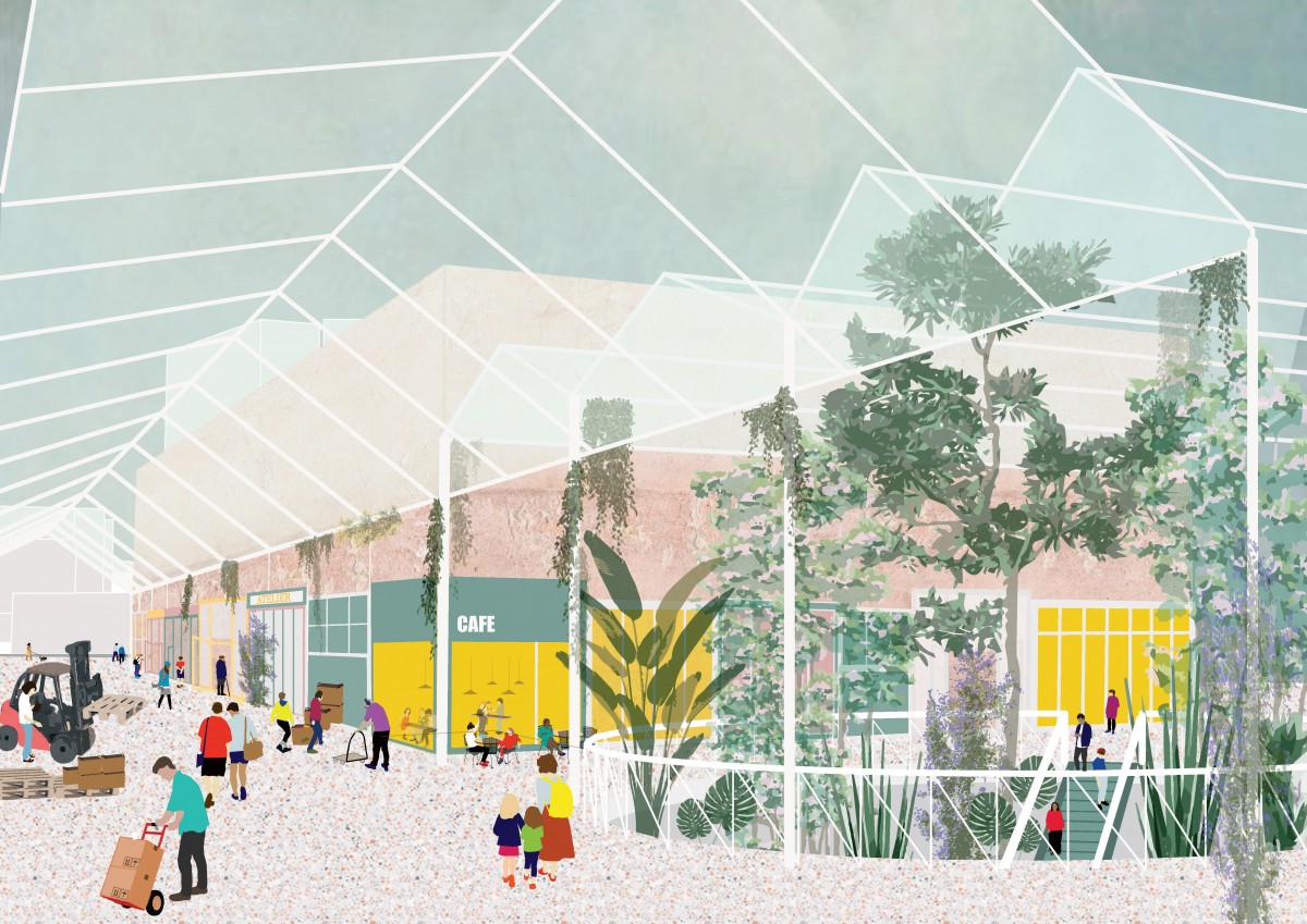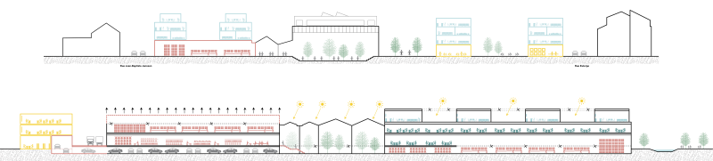 Imagine a car-free block, generously planted. The northern half is primarily productive: the existing central hall, centuries old, is transformed into a METABOLIC MACHINE whose most important added value is the bottling facility and the glass-roofed corridor crossing east-westwards the site. This machine will work as an incubator that accommodates local SMEs looking for space in the city and wishing to push urban food to a new dimension. At first, while the program will be landing on the site, local retailers, associations, and companies will be welcome on a transitory basis to test the possibilities offered by the existing structures. Their activities will attract a new public to the site, allowing to open it as early as possible to the surrounding neighborhoods.