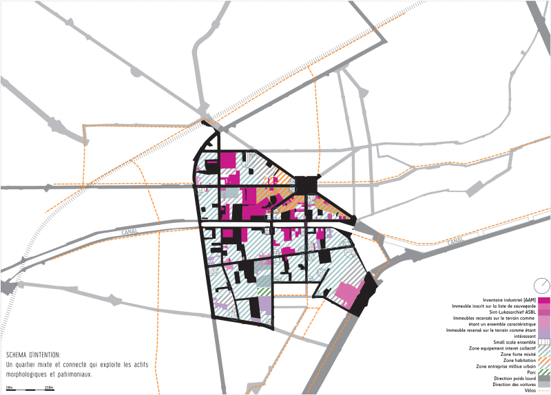 The Heyvaert district is a special place, defined by a heavy industrial heritage, it has been gifted a rich built heritage (sometimes with the presence of pollution). In Brussels, it has a strategic location. Located between the new parks of the Porte de Ninove and the Beekkant station, adjacent to the commercial and productive pole of the Abattoirs, close to the Southstation, crossed by the Brussels - Charleroi Canal, and served tangentially by the intermodal hub of the West station. Despite this strategic location, the district retains an insular character in places, wedged between the same infrastructures that connect this district to the rest of the region: the inner ring road, the canal, the Chaussée de Ninove and Rue Ropsy-Chaudron. These are both arteries and boundaries to cross. Similarly, the apparent clarity of the street grid is in constant conflict with the chaotic organization of mobility within this urban grid.