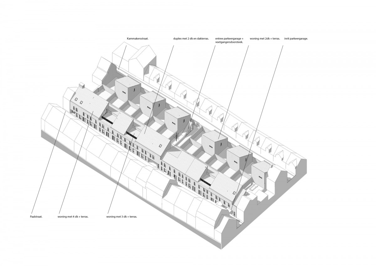 The client for this project, a social housing company, wanted to realize a rational residential project with underground neighborhood parking on a site in the historic heart of Bruges.