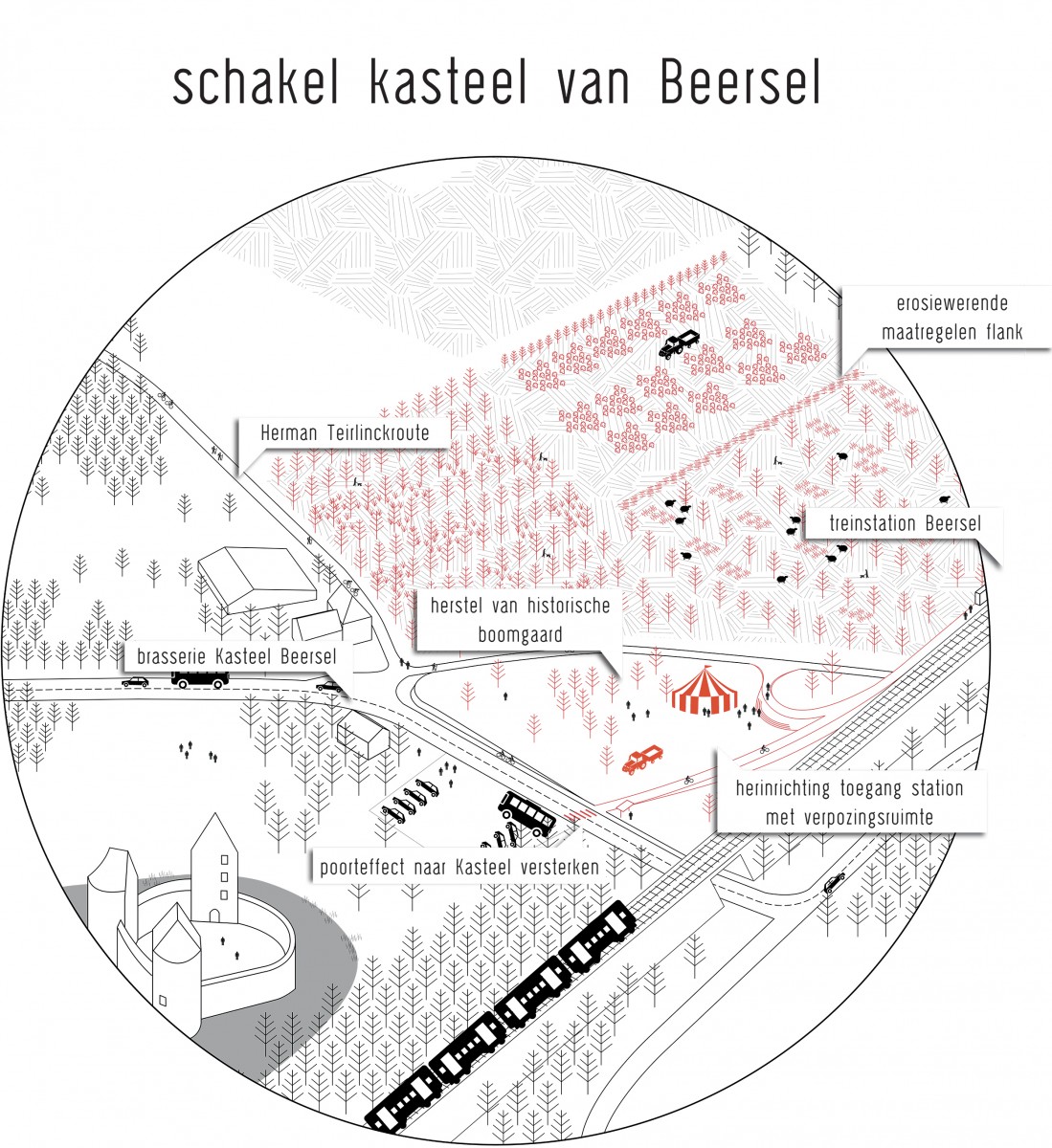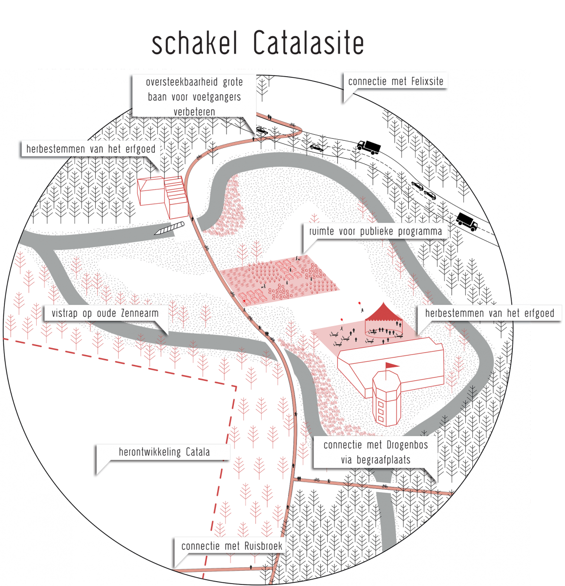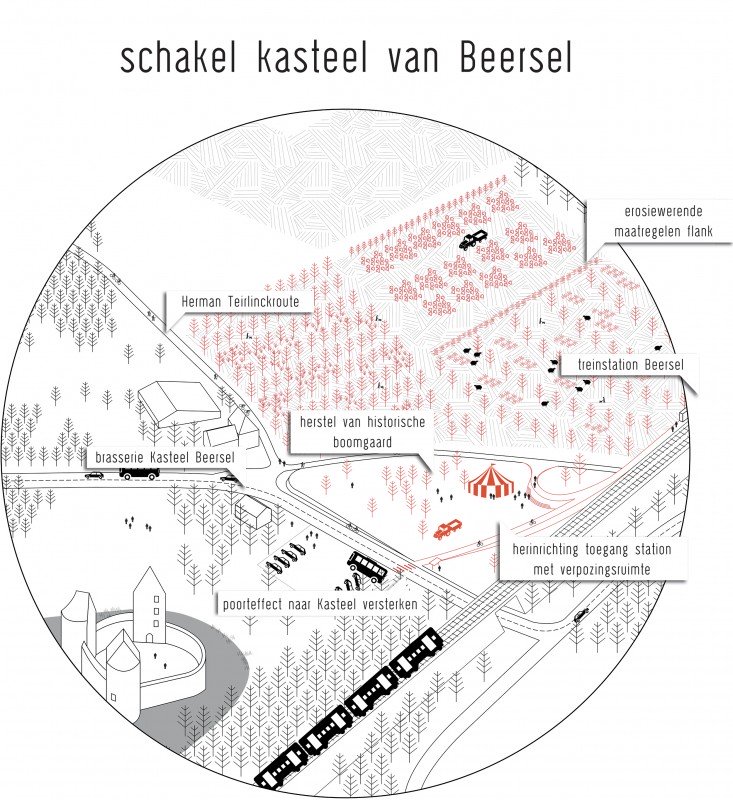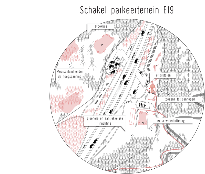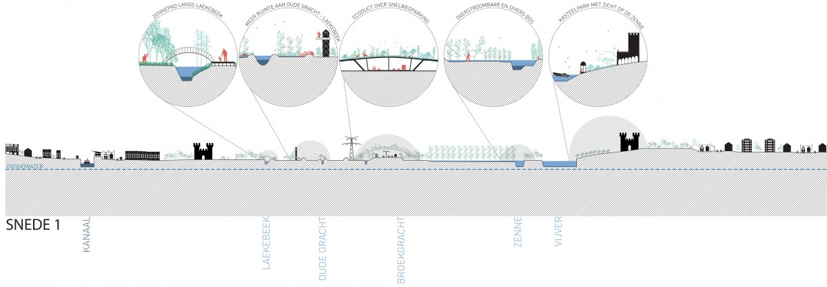 The Senne valley is heavily fragmented by infrastructure: the ABC canal, the railway connection, and the ringroad around Brussels. The Senne river has been enclosed, causing the valley to disappear as a wetland ecosystem. Because of this progressive pavement of the Senne basin in combination with mutation in the rainfall regime due to climate change (i.e. increasing periods of intense rainfall), the current water system has reached its limits. In November 2010, the canal and the Senne in Lot, Ruisbroek and Anderlecht have been flooded in an attempt to keep Brussels dry. The Senne forms a complex hydraulic system with the ABC canal, as its flows are artificially maintained. A solution requires a strategy on the scale of the basin: infiltration on the hilltops, slowing down the water on the slopes, providing sufficient storage capacity in the valley. Concerning that storage or buffering capacity, it was calculated that some 3 million m3 are needed upstream relative to Brussels, of which 2 million m3 can be collected in the Walloon region. The realisation of the remaining capacity opens up an enormous potential for ecological and recreational synergies, but also for new forms of land use and management.